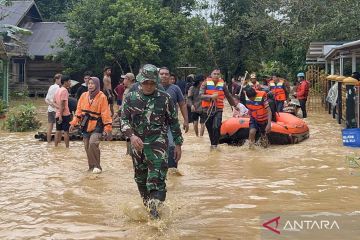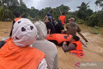 Petugas gabungan mengevakuasi warga dengan menggunakan perahu karet di Desa Juuh, Kecamatan Tebing Tinggi, Kabupaten Balangan, Kalimantan Selatan, Sabtu (27/12/2025). Berdasarkan data dari Polres Balangan sebanyak 1.466 rumah dan 1.615 kepala keluarga (KK) terdampak banjir bandang di delapan desa yang berada di daerah tersebut. ANTARA FOTO/Ragil Darmawan/YU