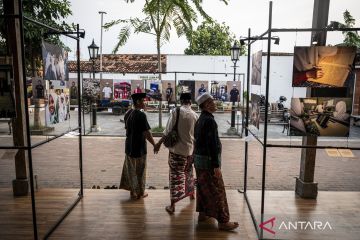 Pengunjung melihat karya foto yang ditampilkan dalam Pameran Foto Jurnalistik Santri Volume 2 di Rumah Nyonya Lasem, Kabupaten Rembang, Jawa Tengah, Sabtu (18/10/2025). Kantor Berita ANTARA berkolaborasi dengan Yayasan Lasem Heritage, Pewarta Foto Indonesia (PFI) Semarang, serta sejumlah pemangku kepentingan terkait menggelar pameran foto jurnalistik yang menampilkan 123 karya dalam rangka memperingati Hari Santri 2025 dan berlangsung hingga 25 Oktober 2025. ANTARA FOTO/Aprillio Akbar/nz