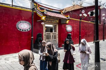 Pengunjung berjalan di depan pintu gerbang rumah kuno di Karangturi, Lasem, Rembang, Jawa Tengah, Minggu (19/10/2025). Menurut data Yayasan Lasem Heritage, terdapat sekitar 243 bangunan kuno berarsitektur akulturasi Tiongkok, Eropa, dan Jawa yang dibangun pada akhir abad ke-18 hingga awal abad ke-20 di Kecamatan Lasem, yang kini telah ditetapkan sebagai cagar budaya tingkat kabupaten sebagai upaya melestarikan kawasan tersebut sekaligus mengembangkannya sebagai destinasi wisata berbasis pelestarian sejarah dan budaya. ANTARA FOTO/Aprillio Akbar/wpa.