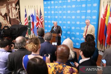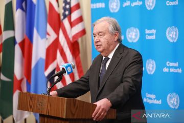 Sekretaris Jenderal Perserikatan Bangsa-Bangsa (PBB) Antonio Guterres berbicara kepada pers di markas besar PBB di New York, Amerika Serikat, Selasa (14/4/2026). Guterres mengatakan bahwa dimulainya kembali perundingan antara Washington dan Teheran sangat mungkin terjadi. ANTARA FOTO/Xinhua/Xie E/bar