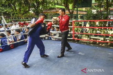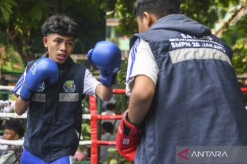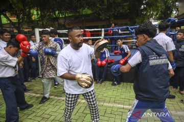 Siswa berlatih tinju saat peresmian kegiatan olahraga tinju di SMPN 28 Jakarta, Jakarta, Selasa (28/10/2025). SMPN 28 Jakarta yang merupakan percontohan Sekolah Laboratorium Pancasila (SLP) itu meresmikan olahraga tinju dalam kegiatan sekolah sebagai media pencegahan tawuran. ANTARA FOTO/Hafidz Mubarak A/nym.