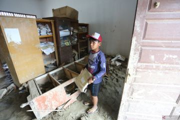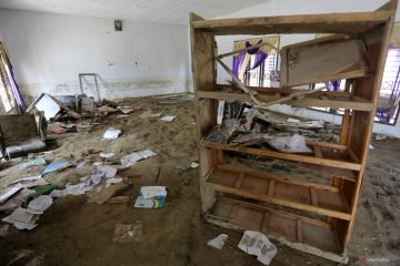 Seorang murid berada di dalam ruang guru yang rusak dan kotor akibat endapan lumpur di SDN 12 Desa Agusen, Blangkejeren, Gayo Lues, Aceh, Rabu (28/1/2026). Sekolah tersebut hingga saat ini belum mendapatkan bantuan penanganan sejak terdampak bencana hidrometeorologi pada akhir November 2025 lalu. ANTARA FOTO/Syifa Yulinnas/wsj.
