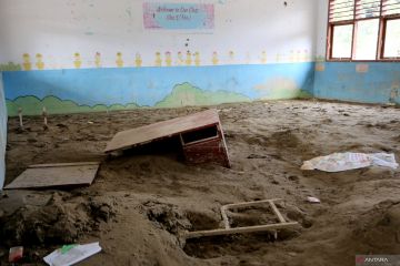Kondisi sebuah ruang kelas dan perlengkapan sekolah yang rusak dan tertimbun endapan lumpur di SDN 12 Desa Agusen, Blangkejeren, Gayo Lues, Aceh, Rabu (28/1/2026). Sekolah tersebut hingga saat ini belum mendapatkan bantuan penanganan sejak terdampak bencana hidrometeorologi pada akhir November 2025 lalu. ANTARA FOTO/Syifa Yulinnas/wsj.