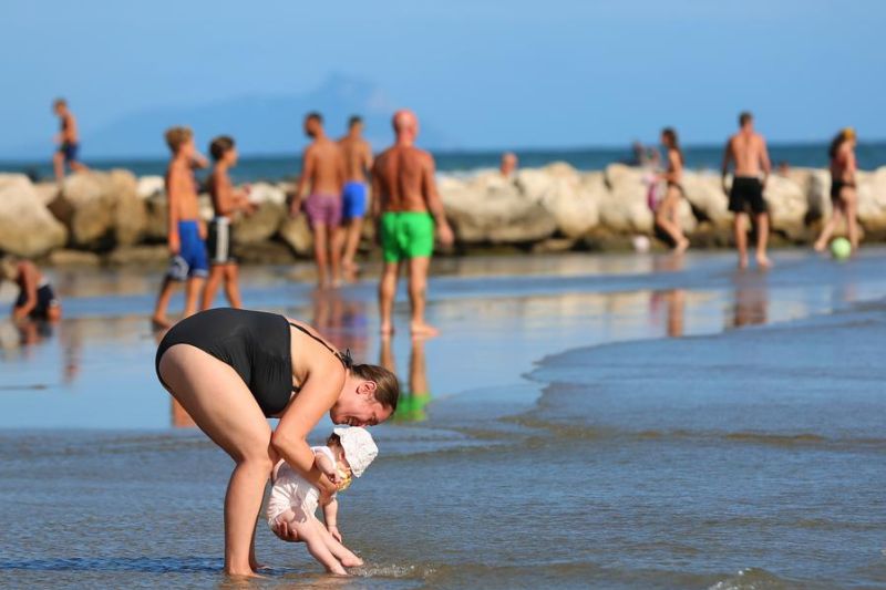 Seorang bayi terlihat di pantai dekat Nettuno, Italia, 26 Juli 2025. (Xinhua/Li Jing)