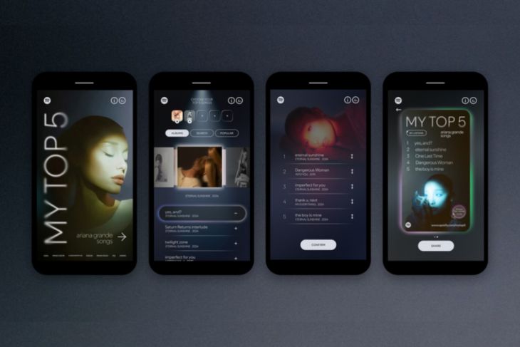 Spotify hadirkan "My Top 5" Ariana Grande. (ANTARA/HO-Spotify)Setelahnya penggemar bisa membagikan hasil "My Top 5" tersebut. Penggemar bakal menerima dua kartu untuk bisa dibagikan ke media sosial. Satu kartu menampilkan pilihan pribadinya, sementara satu kartu lainnya berisikan data hasil pemutaran lagu di Spotify.