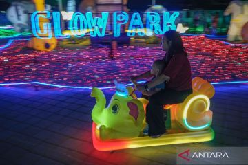 Pengunjung berada di salah satu wahana di area Glow Park di Pelataran The Park Kendari, Sulawesi Tenggara, Jumat (17/10/2025). Taman bermain tersebut menjadi salah satu alternatif hiburan warga setempat yang menyediakan sejumlah spot foto estetik dengan harga tiket sebesar Rp30 ribu - Rp50 ribu. ANTARA FOTO/Andry Denisah/YU