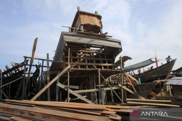 Pekerja menyelesaikan pembuatan kapal nelayan di dermaga Pelabuhan Perikanan Samudera (PPS) Banda Aceh, Aceh, Rabu (29/10/2025). Kementerian Kelautan dan Perikanan (KKP) menargetkan memodernisasi sebanyak 1.582 kapal perikanan nelayan secara bertahap dari bahan dasar kayu menjadi kapal besi sehingga tangkapan ikannnya lebih higienis dan berkualitas setara dengan produksi negara-negara maju. ANTARA FOTO/Ampelsa/bar