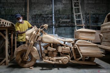 Perajin menyelesaikan proses akhir pembuatan kerajinan replika mobil dan motor dari kayu di Tetap Jaya Wood Art, Mojosongo, Boyolali, Jawa Tengah, Rabu (22/10/2025). Kementerian Usaha Mikro, Kecil, dan Menengah (UMKM) menargetkan penyaluran Kredit Usaha Rakyat (KUR) sektor produksi pada 2026 sebesar 62 persen menyusul capaian target pada tahun 2025 mencapai 32,5 trilliun atau sebesar 60,5 persen yaitu melampaui target sebesar 60 persen. ANTARA FOTO/Mohammad Ayudha/foc.