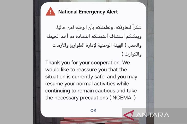 Notifikasi dari otoritas UEA yang menginformasikan kondisi terkini telah aman dan normal menyusul ketegangan yang terjadi di wilayah Timur Tengah, Sabtu (28/2/2026). ANTARA/Hanni Sofia/aa.