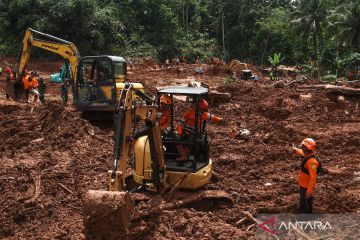 Tim SAR gabungan melakukan pencarian korban longsor menggunakan ekskavator pada hari keempat operasi pencarian di Desa Cibeunying, Majenang, CIlacap, Minggu (16/11/2025). Pada hari keempat operasi pencarian, petugas menambah jumlah ekskavator dari 10 unit menjadi 21 unit untuk mempercapat proses pencarian korban akibat terkendala faktor cuaca dan ketebalan material longsor yang mencapai kedalaman lebih dari 10 meter. ANTARA FOTO/Idhad Zakaria/agr