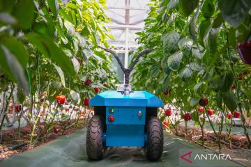 Pengunjung melihat robot penanam bibit saat Pameran Sains dan Teknologi Sayuran Internasional China di Shouguang, Provinsi Shandong, China, Senin (20/4/2026). Pameran masa depan pertanian tanpa awak tersebut menampilkan lebih dari 50 jenis robot pertanian. ANTARA FOTO/Xinhua/Xu Suhui/agr