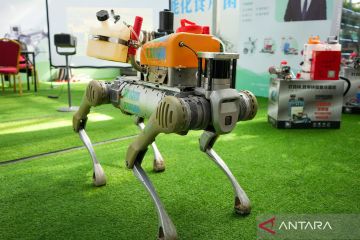 Seekor robot anjing membawa peralatan pertanian saat Pameran Sains dan Teknologi Sayuran Internasional China di Shouguang, Provinsi Shandong, China, Senin (20/4/2026). Pameran masa depan pertanian tanpa awak tersebut menampilkan lebih dari 50 jenis robot pertanian. ANTARA FOTO/Xinhua/Xu Suhui/agr