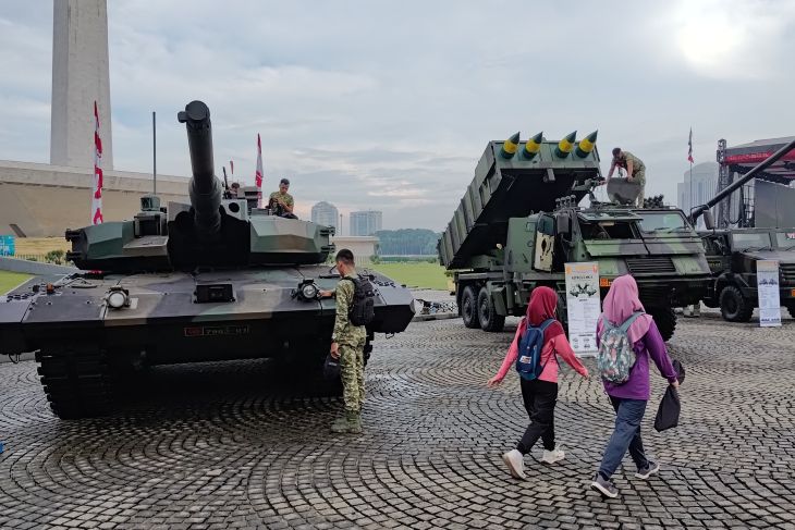 Deretan Alutista TNI AD dipajang di TNI Fair 2025, Kawasan Monas, Jakarta, Sabtu (20/9/2025). (ANTARA/Aria Ananda)Menjelang acara dimulai, sejumlah warga terlihat antusias beraktivitas di sekitar Monas. Ada yang berolahraga, berjalan-jalan bersama keluarga, hingga berswafoto di depan stan dan kendaraan militer. Beberapa anak kecil tampak berlarian sambil menunjuk tank dan panser yang terparkir di area pameran.
