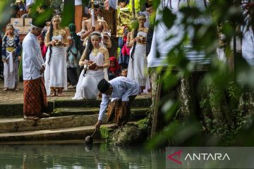 Peserta kirab menuangkan air kembang sawah sebagai simbol pelestarian alam saat kirab budaya Nyadran Kali Sendang Gede di Desa Wisata Kandri, Gunungpati, Semarang, Jawa Tengah, Minggu (7/12/2025). Tradisi yang telah berlangsung secara turun temurun tersebut sebagai bentuk rasa syukur warga kepada Tuhan atas limpahan air dari sendang (mata air) di desa wisata itu sekaligus upaya promosi wisata dan mengenalkan budaya kearifan lokal kepada generasi muda. ANTARA FOTO/Makna Zaezar/tom.