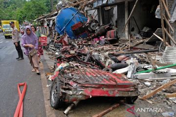 Warga berjalan di sekitar lokasi kecelakaan truk tangki dan minibus di jalan Magelang-Purworejo Desa Kalijambe, Bener, Purworejo, Jawa Tengah, Selasa (11/11/2025). Kecelakaan maut di jalur tengkorak tersebut melibatkan truk tangki bermuatan solar dan dua mobil yang mengakibatkan satu orang tewas dan tiga luka-luka. ANTARA FOTO/Anis Efizudin/bar