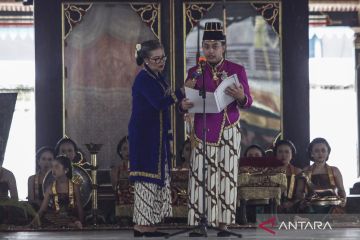 Kanjeng Gusti Pangeran Adipati Anom (KGPAA) Hamangkunegoro Sudibyo Rajaputra Narendra Mataram atau Gusti Purbaya (kanan) membacakan sabda dalem saat Jumenengan Dalem Nata Bhinayangkare atau upacara penobatan raja baru bergelar atau Sampeyan Dalem Ingkang Sinuhun Kanjeng Susuhunan (SISKS) Pakubowono XIV di Keraton Kasunanan Surakarta Hadiningrat, Solo, Jawa Tengah, Sabtu (15/11/2025). Upacara adat tersebut digelar untuk mengumumkan Hamangkunegoro sebagai pewaris tahta Keraton Surakarta Hadiningrat menggantikan ayahnya, Pakubuwana XIII yang wafat Minggu (2/11/2025). ANTARAFOTO/Maulana Surya/sgd