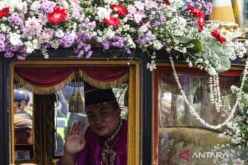 Jumenengan Raja Solo PB XIV. Kanjeng Gusti Pangeran Adipati Anom (KGPAA) Hamangkunegoro Sudibyo Rajaputra Narendra Mataram atau Gusti Purbaya (tengah) melambaikan tangan saat kirab usai Jumenengan Dalem Nata Bhinayangkare atau upacara penobatan raja baru bergelar atau Sampeyan Dalem Ingkang Sinuhun Kanjeng Susuhunan (SISKS) Pakubowono XIV di Keraton Kasunanan Surakarta Hadiningrat, Solo, Jawa Tengah, Sabtu (15/11/2025). Upacara adat tersebut digelar untuk mengumumkan Hamangkunegoro sebagai pewaris tahta Keraton Surakarta Hadiningrat menggantikan ayahnya, Pakubuwana XIII yang wafat Minggu (2/11/2025). ANTARAFOTO/Maulana Surya/sgd