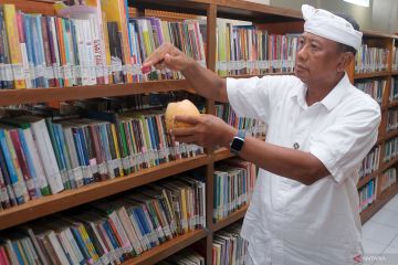 Umat Hindu melakukan persembahyangan terhadap ribuan buku pada Hari Saraswati di Perpustakaan Umum Kota Denpasar, Bali, Sabtu (4/4/2026). Kegiatan yang digelar Dinas Perpustakaan dan Kearsipan Kota Denpasar pada Hari Saraswati tersebut mengupacarai sebanyak 21.844 buku dan 30 bundel lontar atau naskah kuno Bali sebagai wujud syukur serta memperingati turunnya ilmu pengetahuan suci kepada umat manusia. ANTARA FOTO/Nyoman Hendra Wibowo/wsj.