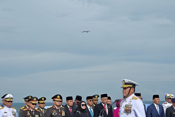 Kepala Staf Angkatan Laut (KASAL) Laksamana TNI Muhammad Ali bertindak sebagai inspektur upacara tabur bunga untuk memperingati Hari Pahlawan Nasional 2025 menggunakan KRI Brawijaya di Perairan Teluk Jakarta, Tanjung Priok, Jakarta Senin (10/11/2025) (ANTARA/M Riezko Bima Elko Prasetyo)Kondisi cuaca yang cerah mewarnai pelayaran, dan memungkinkan burung-burung camar beterbangan mengelilingi kapal perang kebanggaan Indonesia itu kian memperhangat suasana.