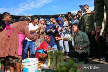 Wakil Presiden Gibran Rakabuming Raka (kanan bawah) berdialog dengan para pedagang di Pasar Wosi, Manokwari, Papua Barat, Rabu (5/11/2025). Dalam kunjungan kerjanya Gibran meninjau harga pangan sekaligus mendukung ekonomi rakyat dengan berbelanja di pasar tersebut. ANTARA FOTO/Chairil Indra/YU