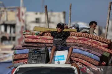 Warga Palestina di kawasan pesisir barat kota dengan membawa barang miliknya yang tersisa bergerak mengungsi ke arah selatan di tengah operasi militer Israel skala besar di Gaza, Kamis (18/9/2025) ANTARA FOTO/Xinhua/Rizek Abdeljawad/nz