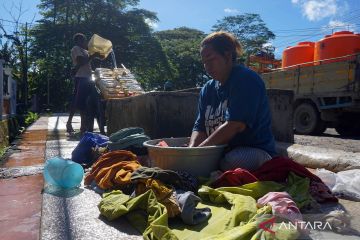 Warga mencuci pakaian dan mengisi air bersih ke dalam jeriken di Kota Sorong, Papua Barat Daya, Rabu (6/8/2025). Sejumlah warga Kota Sorong kesulitan air bersih hingga harus membeli air bersih dari sumber mata air dengan harga Rp5.000 per jeriken 20 liter untuk melakukan aktivitas mencuci dan mandi di sumur. ANTARA FOTO/Olha Mulalinda/bar
