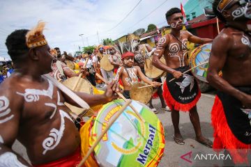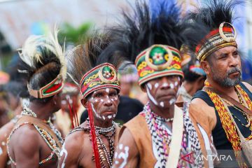 Warga berbusana khas Papua saat mengikuti Parade Budaya 1 Abad Aitumeri di Jalan Saberi Wasior, Distrik Wasior, Kabupaten Teluk Wondama, Papua Barat, Rabu (22/10/2025). Parade budaya yang diikuti berbagai kalangan suku di Papua tersebut dalam rangka perayaan satu abad situs Aitumeri yang merupakan peristiwa sejarah peradaban orang asli Papua mengenal pendidikan formal melalui sekolah yang didirikan Pendeta Dominee Izaack Samuel Kijne di Kampung Miei, Distrik Wasior pada 25 Oktober 1925. ANTARA FOTO/Chairil Indra/YU