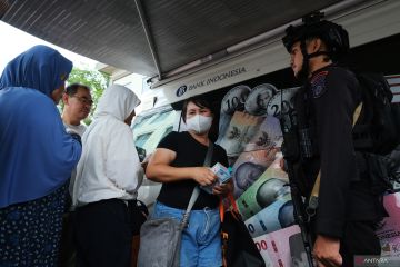 Sejumlah warga mengantre untuk menukarkan uang pecahan rupiah di mobil kas keliling Bank Indonesia saat kegiatan Sempurna di halaman Ayani Megamall, Pontianak, Kalimantan Barat, Jumat (13/2/2026). Sempurna atau Semarak Penukaran Uang Rupiah Tahun Baru Imlek dan Cap Go Meh yang digelar Kantor Perwakilan Bank Indonesia Provinsi Kalimantan Barat di tiga titik pusat perdagangan serta pusat perbelanjaan di Kota Pontianak pada 12-13 Februari 2026 tersebut untuk melayani kebutuhan uang pecahan Rp1.000 hingga Rp50 ribu bagi masyarakat dengan batas maksimal penukaran sebesar Rp5.300.000 per orang. ANTARA FOTO/Jessica Wuysang/foc.