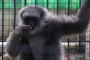 Seekor Owa Jawa (Hylobates moloch) hasil serahan warga berada di dalam kandang saat ditunjukkan di Kantor Balai Besar Konservasi Sumber Daya Alam (BBKSDA) Jawa Barat Seksi Konservasi Wilayah I, Kota Serang, Banten, Selasa (4/11/2025). BBKSDA Jawa Barat Seksi Konservasi Wilayah I mengevakuasi primata dilindungi berjenis kelamin jantan berumur sekitar 1,5 tahun dengan berat sekitar dua kilogram tersebut dalam kondisi sehat yang kemudian akan direhabilitasi sebelum dilepasliarkan ke habitat asalnya. ANTARA FOTO/Angga Budhiyanto/nym.