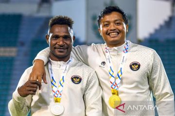 Pelempar lembing Indonesia Abdul Hafiz (kanan) dan Silfanus Ndiken berpose dengan medali mereka usai memenangkan nomor lempar lembing putra SEA Games 2025 Thailand di Suphachalasai Stadium, Bangkok, Senin (15/12/2025). Abdul Hafiz meraih medali emas setelah melakukan lemparan terbaik sejauh 72,82 meter, sementara medali perak juga diraih atlet Indonesia Silfanus Ndiken yang meraih lemparan terbaik kedua sejauh 71,99 meter dan medali perunggu diraih atlet Thailand Sornwichai Wachirawit dengan lemparan terbaik ketiga sejauh 69,62 meter. ANTARA FOTO/Muhammad Ramdan/tom.