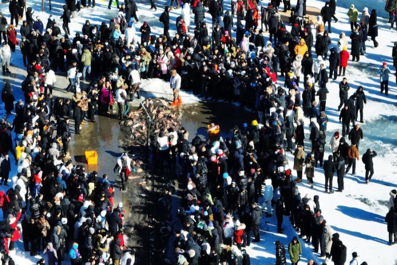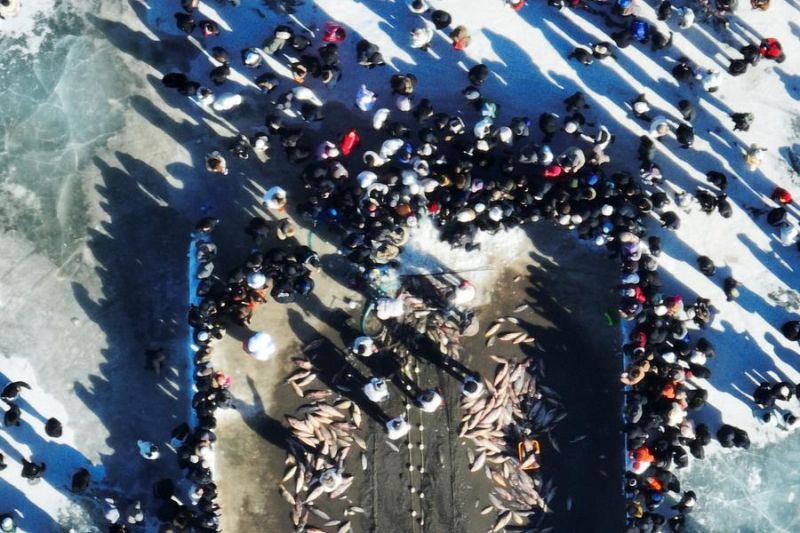 Foto dari udara yang diabadikan dengan drone pada 24 Januari 2026 ini menunjukkan orang-orang menyaksikan aktivitas menangkap ikan di Danau Wolong di wilayah Kangping, Shenyang, Provinsi Liaoning, China timur laut. (ANTARA/Xinhua/Li Gang)Pewarta: Xinhua