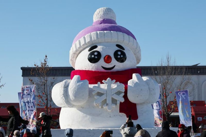 Para wisatawan memotret manusia salju raksasa dalam acara memancing musim dingin di Danau Wolong di wilayah Kangping, Shenyang, Provinsi Liaoning, China timur laut, pada 24 Januari 2026. (ANTARA/Xinhua/Li Gang)