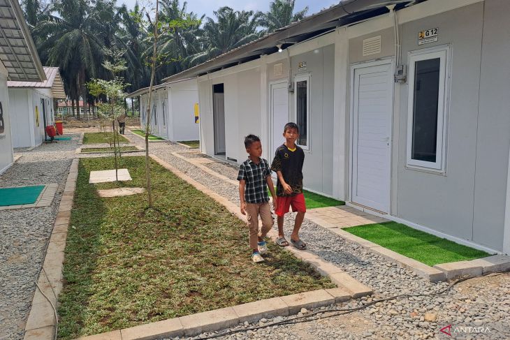 Sejumlah bocah berjalan di halaman rumah hunian sementara (huntara) yang dibangun Kementerian PU untuk korban bencana hidrometeorologi di Desa Bundar, Aceh Tamiang, Aceh, Kamis (22/1/2026). Kementerian PU membangun 240 unit huntara untuk warga terdampak yang kehilangan rumah akibat banjir bandang di Kabupaten Aceh Tamiang akhir November 2025. (ANTARA/FB Anggoro)Baca juga: Suasana haru warnai perpisahan prajurit Yonif 115 di Aceh Tamiang