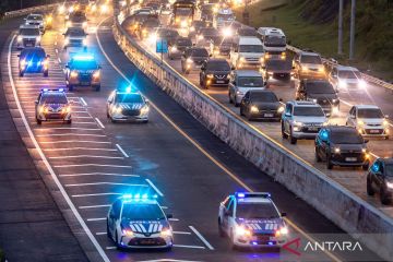 Sejumlah kendaraan kepolisian (kiri) melaju saat mengawali pemberlakuan sistem dua jalur satu arah di Tol Trans Jawa, Semarang-Solo Km 443, Bawen, Kabupaten Semarang, Jawa Tengah, Selasa (24/3/2026). Ditlantas Polda Jateng pada Selasa (24/3) atau H+2 Lebaran mulai pukul 17.36 WIB memberlakukan sistem satu arah lokal secara situasional dari arah Tol Salatiga KM 459 hingga GT Kalikangkung KM 414 menyusul meningkatnya volume kendaraan. ANTARA FOTO/Aji Styawan/nym.