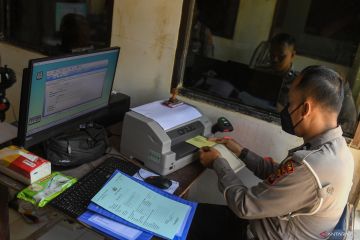 Anggota Ditlantas Polda Aceh mencetak Buku Pemilik Kendaraan Bermotor (BPKB) di Polres Aceh Tamiang, Aceh, Senin (26/1/2026). Polda Aceh bekerja sama dengan Pemerintah Provinsi Aceh membuka posko pelayanan khusus bagi masyarakat terdampak bencana banjir dan tanah longsor untuk pengurusan STNK dan BPKB yang hilang maupun rusak. ANTARA FOTO/Nova Wahyudi/wsj.
