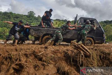 Anggota TNI membantu mendorong mobil angkutan bantuan bencana yang terjebak di jalan darurat berlumpur di Batu Busuk, Padang, Sumatera Barat, Sabtu (13/12/2025). Akses utama ke daerah terdampak banjir bandang itu kembali putus karena luapan air sungai pada Kamis (11/12) dan kini hanya bisa dilewati pejalan kaki dan pengendara sepeda motor dibantu warga setempat, sementara untuk mobil akan sangat berisiko. ANTARA FOTO/Iggoy el Fitra/nym.