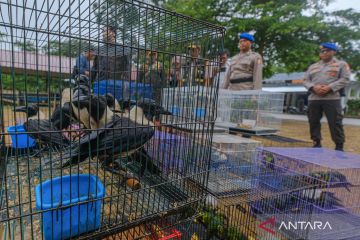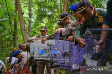 Petugas Balai Konservasi Sumber Daya Alam (BKSDA) Sultra, personel Kepolisian Perairan dan Udara (Polairud) Badan Pemeliharaan Keamanan (Barhakam) Polri, dan petugas Balai Karantina Hewan, Ikan dan Tumbuhan (BKHIT) Sultra melepasliarkan seratusan burung endemik di kawasan Suaka Alam Margasatwa Tanjung Peropa, Kabupaten Konawe Selatan, Sulawesi Tenggara, Rabu (28/1/2026). BKSDA Sulawesi Tenggara melepasliarkan 182 ekor burung endemik Sulawesi Tenggara hasil sitaan Korpolairud Barhakam Polri bersama BKHIT Sultra yang hendak diselundupkan ke Surabaya melalui jalur laut pada Sabtu (24/1) lalu. ANTARA FOTO/Andry Denisah/nz