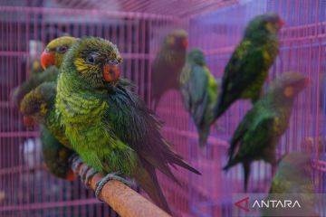 Sejumlah burung perkici (Trichoglossus meyeri) berada di dalam kandang sebelum pelepasliaran di kawasan Suaka Alam Margasatwa Tanjung Peropa, Kabupaten Konawe Selatan, Sulawesi Tenggara, Rabu (28/1/2026). BKSDA Sulawesi Tenggara melepasliarkan 182 ekor burung endemik Sulawesi Tenggara hasil sitaan Korpolairud Barhakam Polri bersama BKHIT Sultra yang hendak diselundupkan ke Surabaya melalui jalur laut pada Sabtu (24/1) lalu. ANTARA FOTO/Andry Denisah/nz