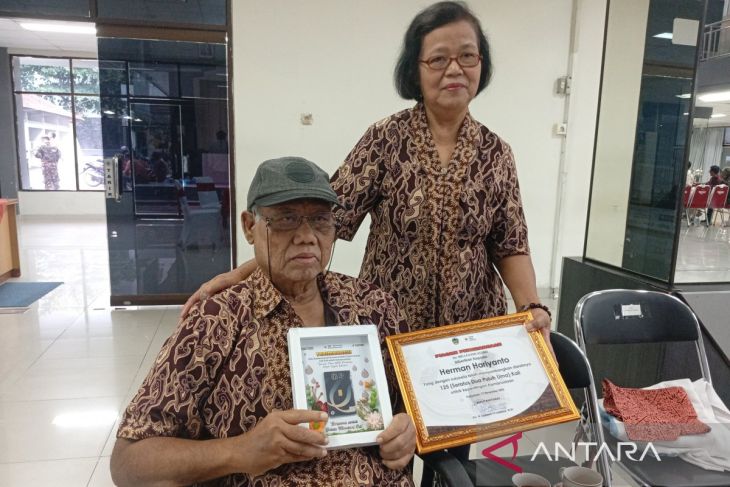 Herman Hariyanto (70) menunjukkan penghargaan? dari PMI Kabupaten Banyumas sebagai penderma yang telah 168 kali donor darah di Purwokerto, Kabupaten Banyumas, Jawa Tengah, Minggu (23/11/2025). ANTARA/SumarwotoPewarta: Sumarwoto