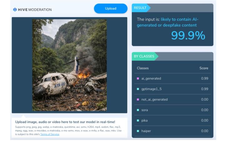 Pemeriksaan menggunakan AI Detector Hive Moderation menunjukkan bahwa foto tersebut 99,9 persen merupakan hasil rekayasa kecerdasan buatan (AI).