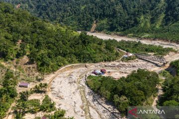 Foto udara jembatan yang putus di Desa Pasir Putih Kecamatan Pining, Kabupaten Gayo Lues, Aceh, Sabtu (31/1/2026). Desa Pasir Putih, Kecamatan Pining yang dihuni oleh 157 KK menjadi salah satu desa yang terisolir akibat jembatan yang putus serta listrik yang belum pulih pascabencana banjir bandang dan longsor pada akhir November 2025 lalu. ANTARA FOTO/Raisan Al Farisi/wpa