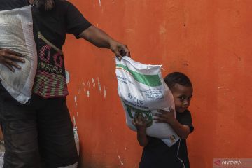 Warga Penerima Bantuan Pangan (PBP) membawa beras yang diterima saat penyaluran bantuan pangan di Gudang Bulog Ternate, Maluku Utara, Rabu (8/4/2026). Perum Bulog Cabang Ternate bersama Pemerintah Provinsi Maluku Utara menyalurkan bantuan pangan alokasi Februari-Maret 2026 sebanyak 2.248.560 kilogram beras dan 449.712 liter minyak goreng kepada 112.428 warga Penerima Bantuan Pangan (PBP) yang tersebar 10 kabupaten/kota di Maluku Utara dalam upaya membantu kebutuhan ekonomi masyarakat. ANTARA FOTO/Andri Saputra/foc.