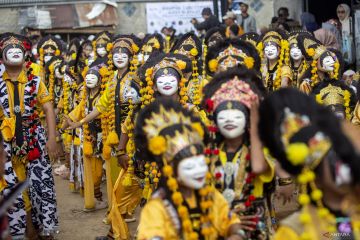 Sejumlah penari mementaskan tari Topeng Samba gaya Slangit di Desa Slangit, Kabupaten Cirebon, Jawa Barat, Jumat (10/4/2026). Pementasan rampak tari Topeng Samba yang diikuti 500 penari topeng tersebut digelar dalam rangka memeriahkan tradisi Mapagsri menyambut musim panen padi. ANTARA FOTO/Dedi Suwidiantoro/foc.
