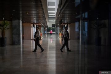 Petugas Pengamanan Dalam (Pamdal) berpatroli di Gedung Nusantara II, Kompleks Parlemen, Senayan, Jakarta, Jumat (10/4/2026). Sejumlah pegawai di Kompleks Parlemen menjalankan kebijakan bekerja dari rumah (WFH) sesuai dengan surat edaran (SE) dari MenpanRB dan SE Mendagri. ANTARA FOTO/Rivan Awal Lingga/foc.