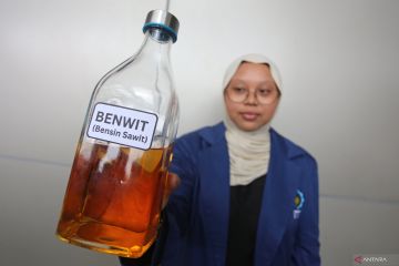 Anggota tim riset Institut Teknologi Sepuluh Nopember (ITS) Syahrin Haifa memperlihatkan bahan bakar alternatif berbasis kelapa sawit bensin biogasoline sawit ITS (Benwit) di Gedung Pusat Riset ITS, Surabaya, Jawa Timur, Selasa (7/4/2026). Bensin biogasoline sawit ITS (Benwit) tersebut dikembangkan melalui modifikasi crude palm oil (CPO) dan refined, bleached, and deodorized palm oil (RBDPO) dengan metode catalytic cracking sebagai salah satu solusi energi alternatif guna mendukung kemandirian energi nasional. ANTARA FOTO/Moch Asim/foc.