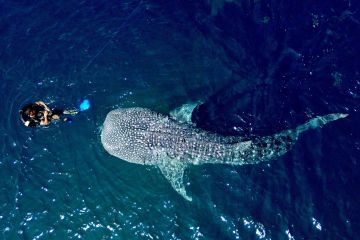 Pemandu wisata berenang bersama hiu paus (Rhincodon Typus) di Pantai Botubarani, Kabupaten Bone Bolango, Gorontalo, Senin (23/3/2026). Kelompok sadar wisata (Pokdarwis) setempat mencatat lonjakan pengunjung di objek wisata hiu paus sejak H-3 Lebaran dengan rata-rata 700 orang/hari yang didominasi wisatawan dari Sulawesi Utara. ANTARA FOTO/Adiwinata Solihin/sgd