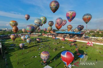 Foto udara balon udara diterbangkan dengan cara ditambatkan di tanah saat final Pekalongan Balloon Festival di Stadion Hoegeng, Kota Pekalongan, Jawa Tengah, Sabtu (28/3/2026). Pemerintah Kota Pekalongan menggelar Pekalongan Balloon Festival yang diikuti 40 kelompok peserta pada final dengan menerbangkan balon udara yang telah ditambatkan pada tanah bertujuan untuk menjaga tradisi Syawalan usai merayakan Idul Fitri 1447 H dan sebagai upaya menertibkan balon udara agar tidak diterbangkan secara liar yang dapat mengganggu lalu lintas udara. ANTARA FOTO/Harviyan Perdana Putra/sgd