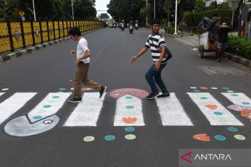 Pengguna jalan melintasi zebra cross buatan warga di Jalan Soepomo, Pancoran, Jakarta, Minggu (29/3/2026). Dinas Bina Marga DKI Jakarta segera membongkar zebra cross di kawasan tersebut yang dibuat berdasarkan inisiatif warga setempat karena dinilai tidak sesuai standar teknis dan berpotensi membahayakan pengguna jalan. ANTARA FOTO/Indrianto Eko Suwarso/sgd