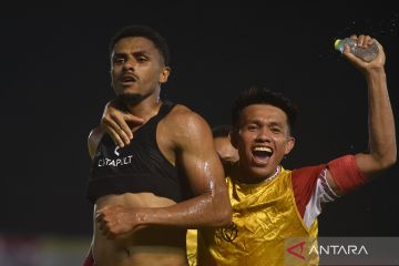 Pesepak bola Semen Padang FC Maicon Souza (kiri) melakukan selebrasi bersama rekannya Kasim Botan (kanan) usai menjebol gawang Malut United pada pertandingan lanjutan BRI Super League di Stadion GOR H Agus Salim Padang, Sumatera Barat, Jumat (20/2/2026). Semen Padang FC menahan imbang tamunya Malut United dengan skor 2-2. ANTARA FOTO/Fitra Yogi/bar