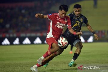 Pesepak bola Semen Padang FC Kasim Botan (kiri) menggiring bola dibayangi pesepak bola Malut United Yance Sayuri (kanan) pada pertandingan lanjutan BRI Super League di Stadion GOR H Agus Salim Padang, Sumatera Barat, Jumat (20/2/2026). Semen Padang FC menahan imbang tamunya Malut United dengan skor 2-2. ANTARA FOTO/Fitra Yogi/bar